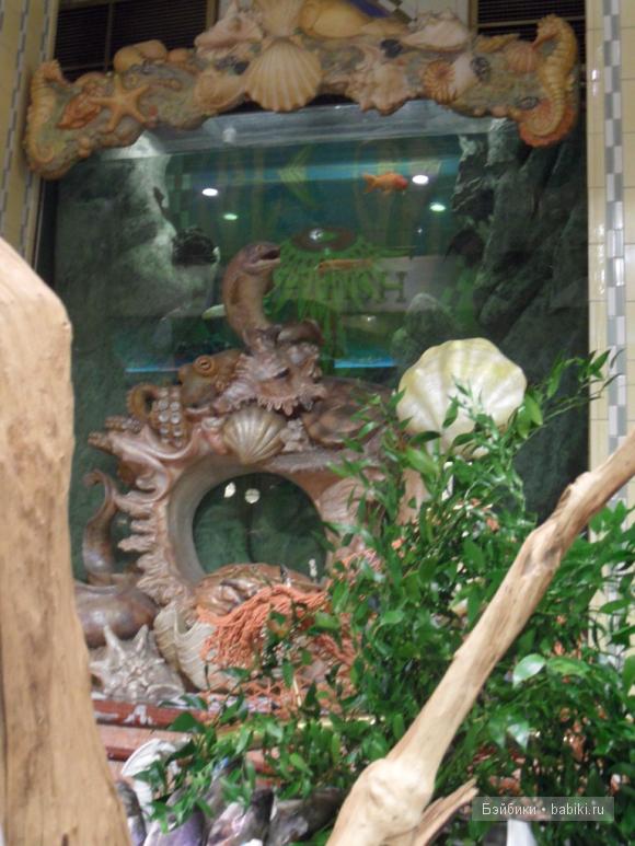 Ну вот, наконец-то, наш столик свободен, и мы проходим в зал. Честно говоря, назвать это «залом» язык не поворачивается – это настоящий лес, с движущимися фигурами обезьян, гепардов, слонов, бабочек, с раскатами грома и сверканием молний, с журчанием воды и обилием экзотических растений, с рыбками, плавающими перед столиками. За что моя дочь любит это кафе (впервые мы были в подобном в Диснейленде), там детям дарят подарки. В это раз подарили набор для рисования, маску жирафки, игру «пятнашки», набор открыток, какую-то игру в карточки, брелок, магнитик – в общем, целую сумочку подарков! Мелочь, а приятно!