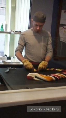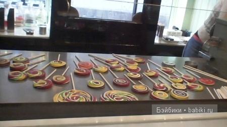 Внутри можно увидеть процесс изготовления леденцов. Из разноцветного карамельного теста (толстенная колбаса горячей карамели) кондитер вытягивает жгут, сворачивает его по кругу и затем передаёт стоящей рядом девушке.
