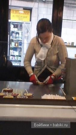 Он режет жгут особыми щипцами и, специально для нас, отрезал 4 маленьких кусочка горячей карамели. Очень вкусно, дети были в восторге. Девушка кладёт свитый из жгута круг в металлическую форму, вставляет палочку и затем вытряхивает готовый леденец. Так как жгут вытягивается неравномерно, то все конфеты имеют разную окраску и вкус, смотря какой цвет в конфете преобладает.