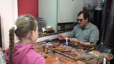 В магазине ювелира – стеклодува мы провели не меньше получаса – Лиза никак не могла оторваться от зрелищной работы мастера. Ей нравилось, как он над пламенем горелки сплавляет вместе несколько видов цветного стекла, как они превращаются в переливающуюся разноцветную каплю, а затем, с помощью специальных щипцов, – в кольцо, бусинку или лепесток волшебного цветка. Увидев неподдельный интерес в глазах ребёнка, стеклодув подарил ей одну из таких капелек (она, кстати, стоила 5 евро).