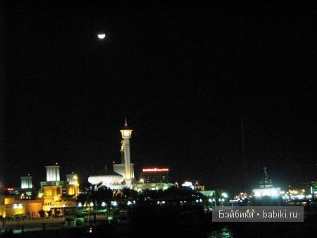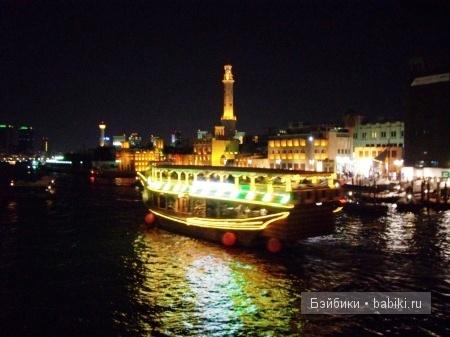 Да, тёмные мы люди. Век живи, век учись. Ведь большинство знаний сидит в голове ещё со школы или института, но когда всё видишь воочию, эта информация теряет свою отстранённость от твоего восприятия и начинает жить не только в разуме, но и в сердце. Очень романтичный оказался ужин (мы были на верхней палубе). Наша лодка была достаточно просторной и широкой, хотя на некоторых лодках столики стояли почти впритык друг ко другу, а людей было, как сельдей в бочке. На ужин предлагалось несколько видов салатов, паштетов, овощей и фруктов. Мясо было просто бесподобным. Единственный недостаток верхней палубы в том, что надо ходить по крутой лесенке вниз за едой, пока собираешься, придёшь, а уже всё съели. Из десертов – несколько видов тортов и выпечка. Голодными никто не останется (мы, по крайней мере, не остались). Хотя виды вокруг такие, что, как у крыловской вороны, в зобу периодически дыхание останавливалось, и хотелось каркнуть что-то особенно возвышенное во всё своё воронье русское горло. Жаль, что запрещено целоваться в общественных местах, хотя, если никто не смотрит, то можно, что мы неоднократно и делали. Ночь, музыка, дрожащие в воде каналов огни, романтическое настроение, любимый человек рядом, запах роз, крики муэдзина, подмигивающая своим восточным глазом арабская луна – что ещё нужно, чтобы почувствовать себя счастливым человеком? Нам очень понравилось. Чисто практическая информация – стоимость экскурсии 50 долларов на человека, кому надо, можно прямо на лодке заказать вино, шампанское или виски – коньяк, кто что предпочитает. Стоимость бутылки домашнего французского вина 135 дирхам. Для не особо пьющих – на двоих приносят 1,5-литровую бутылку минеральной воды. Впрочем, вам и без дополнительного допинга будет хорошо, ведь любящим друг друга везде хорошо вдвоём. Из русскоязычных мы были на лодке одни, в основном англичане, была также одна немецкая пара. Нас забирали от отеля на миниавтобусе «Альфы» с опозданием в 40 минут, так что на лодке ждали только нас, мы прибыли последними. Видимо, у «Альфа – Турс» такой стиль работы – если на полчаса не опоздает, считай, день прошёл напрасно. Мы намеревались посетить также Абу Даби, съездить на Индийский Океан и в Аль Айн, но после нервотрёпки с ожиданием трансфера в порт (хотя до него 15 минут ехать от отеля) решили с экскурсиями повременить. Поэтому все оставшееся время посвятили изучению собственно Дубаи, о чём ни разу не пожалели.