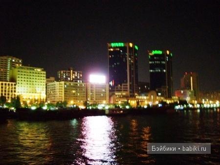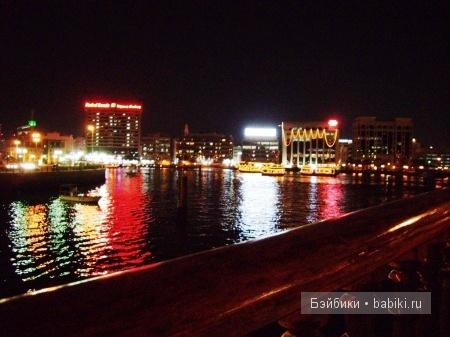 Дубайские небоскребы, не такие уж и высокие непосредственно у берегов, освещены разноцветными огнями, на многих мерцает реклама.