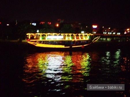 Деревянная двухпалубная лодка, нижняя палуба закрыта (стеклянные окна, а не круглые иллюминаторы), верхняя открыта, еда находится на нижней палубе. Лодки расцвечены огнями, одновременно по каналу плавает до 10-15 таких прогулочных лодок, в темноте они смотрятся очень эффектно. Играет приятная музыка, на каждой лодке преимущественно туристы, так что все снимают друг друга на камеры, проплывая по каналу.