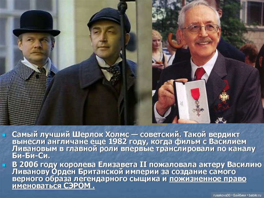 Наш Хеклок Холмс (которого сыграл Васи́лий Лива́нов ) признал лучшим. Его наградила сама королева Елизавета, орденом Британской империи.