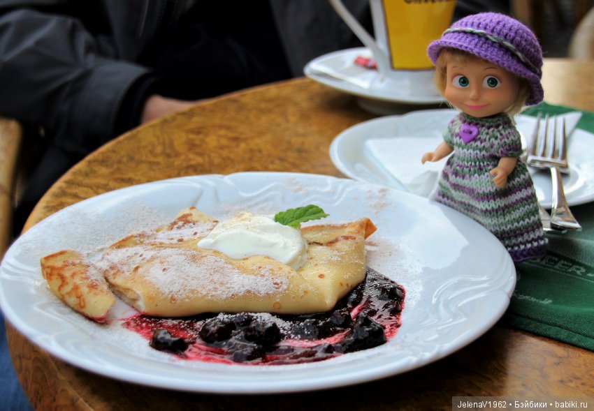 Вот вкусный блинчик с творожной начинкой, черничным соусом и посыпан цимтом. Еле успела сфотографировать.