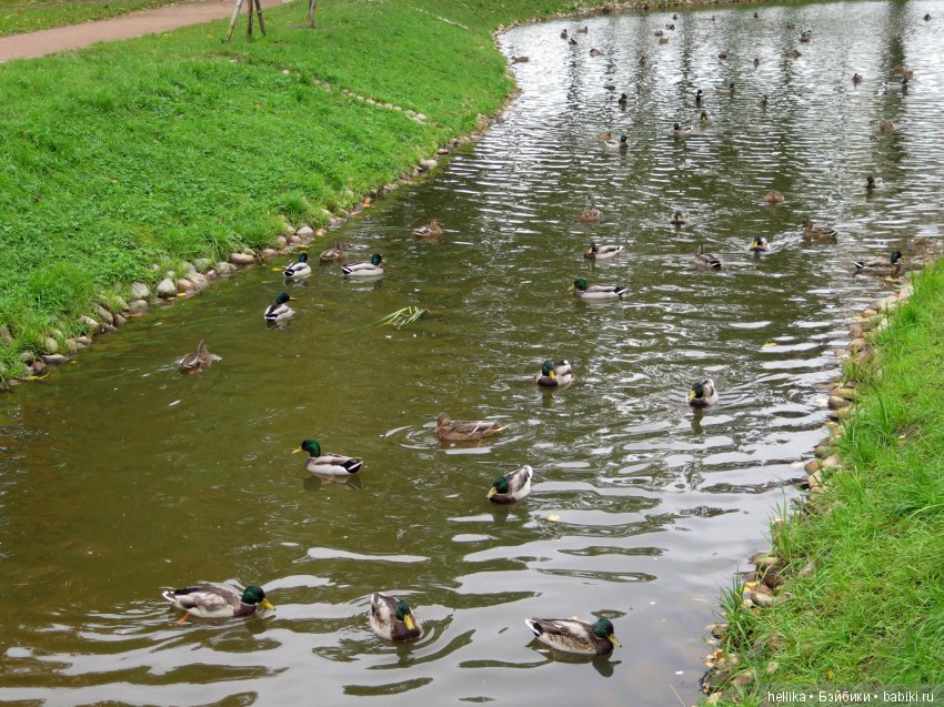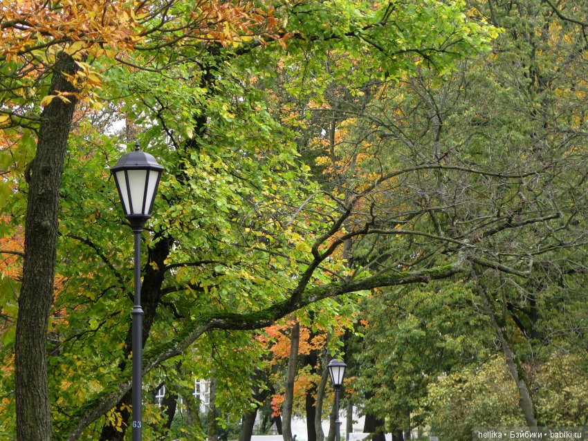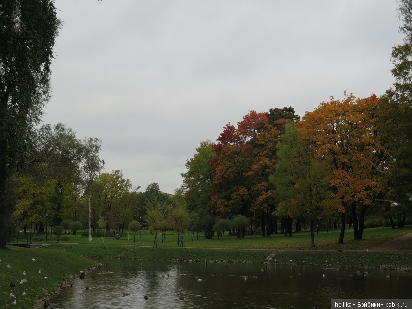 Оказалось, я правильно выбрала место — в парке множество кленов, берез, ив, яблонь и декоративных растений и кустарников, так что листва сияла на фоне серого питерского неба. Очень жаль, что не было солнца, но и дождя тоже не было, только ветер и привычный петербургский сумрак, когда темно даже в полдень. А парк после реконструкции буквально расцвел — там, где были заболоченные тропинки, теперь отсыпанные дорожки, фонари, скамейки и несколько детских площадок. Ручей снова откопали, пруд почистили, и видно, что за парком ухаживают.