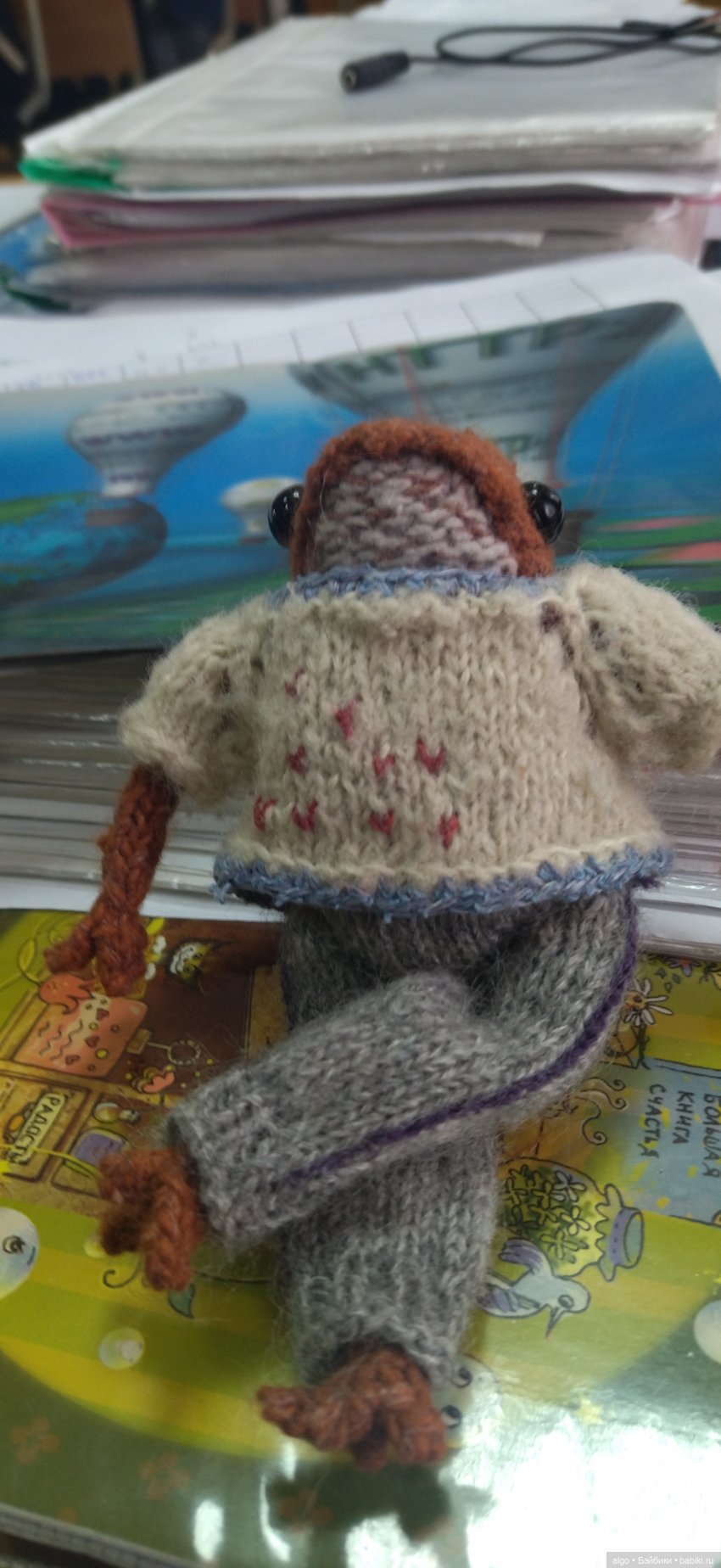 Дочка спросила — «Зачем тебе?», муж сказал — «Раз хочется — надо брать:)». Потом я как-то остыла, потом опять загорелась и вот, на днях приехал мой лягух. Милый такой! Удобный карманный размер — около 10 см. Без каркаса. Изначально глазки были деревянные бусинки, я поменяла их. И вот он посмотрел на меня своими чудесными глазами, и имя сразу нашлось — Тревор ( как у Невила Долгопупса).