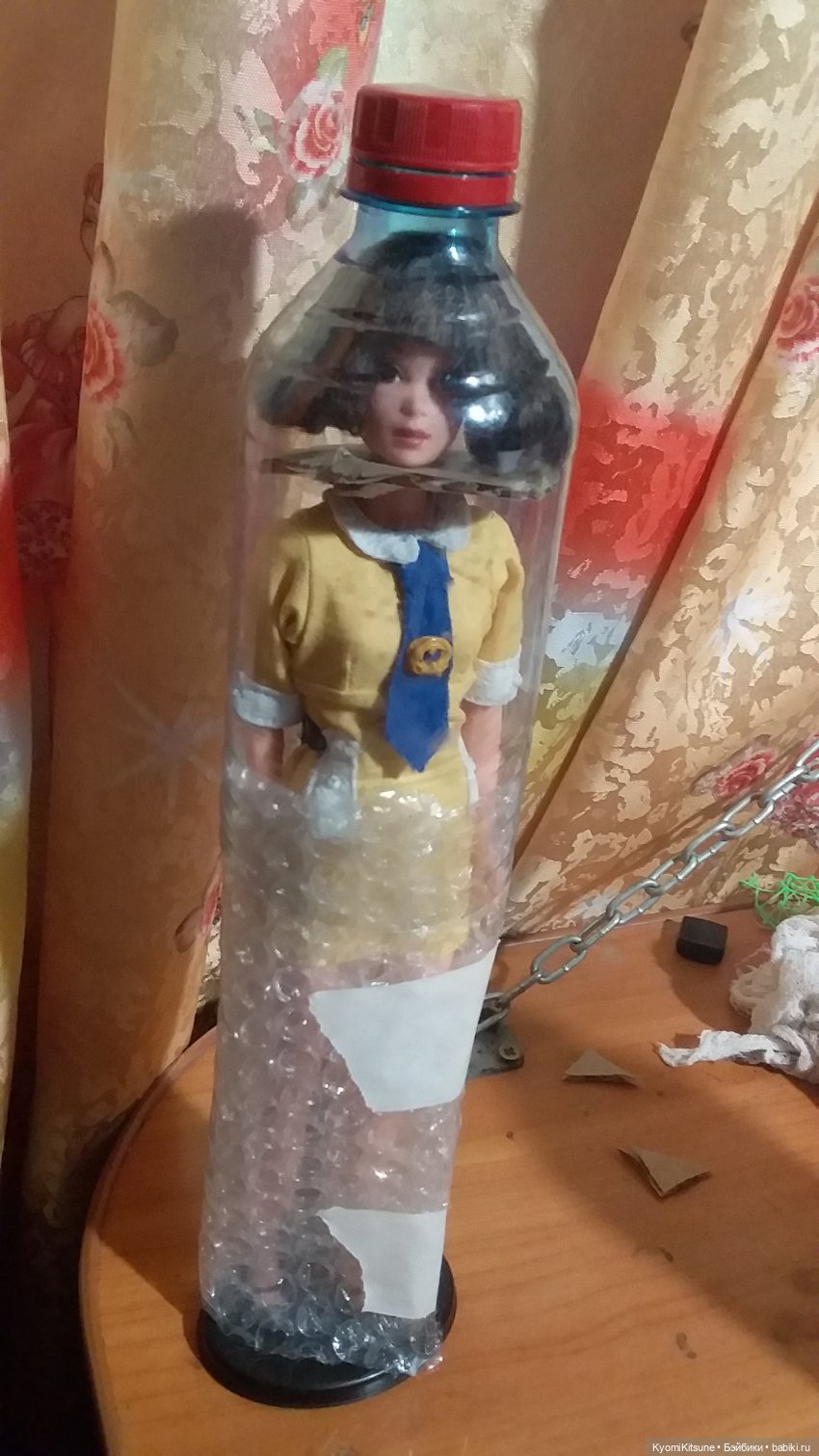 Думала, что повезу ее лицом вниз, но по факту макушка крепко поместилась в горлышко бутылки и не болтается.