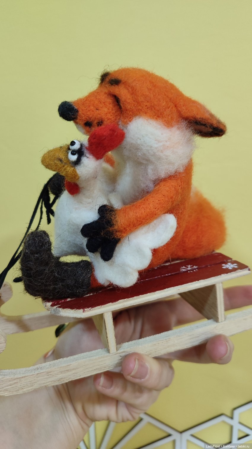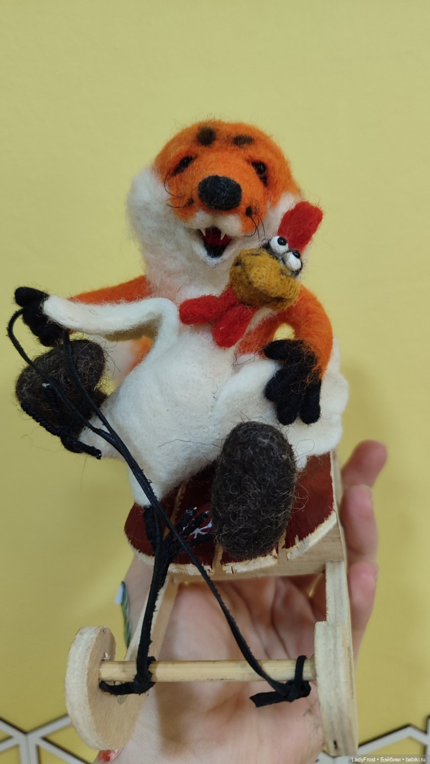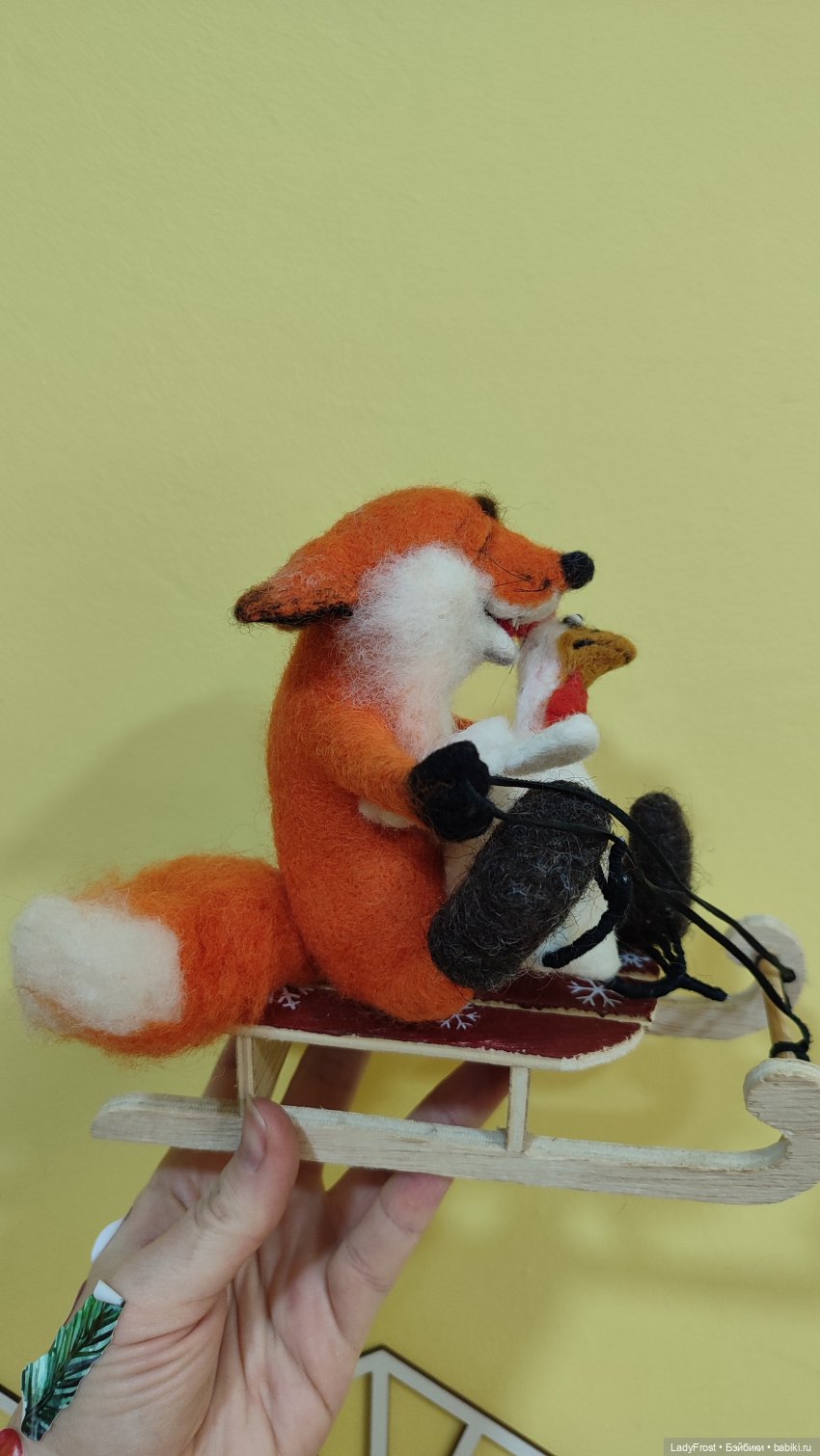 Сани деревянные, лис надежно закреплён проволокой, его клыки сделаны из запекаемой глины.