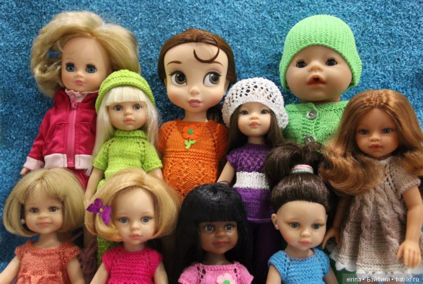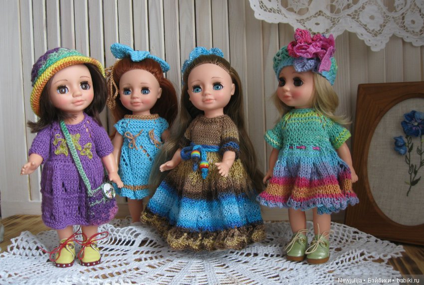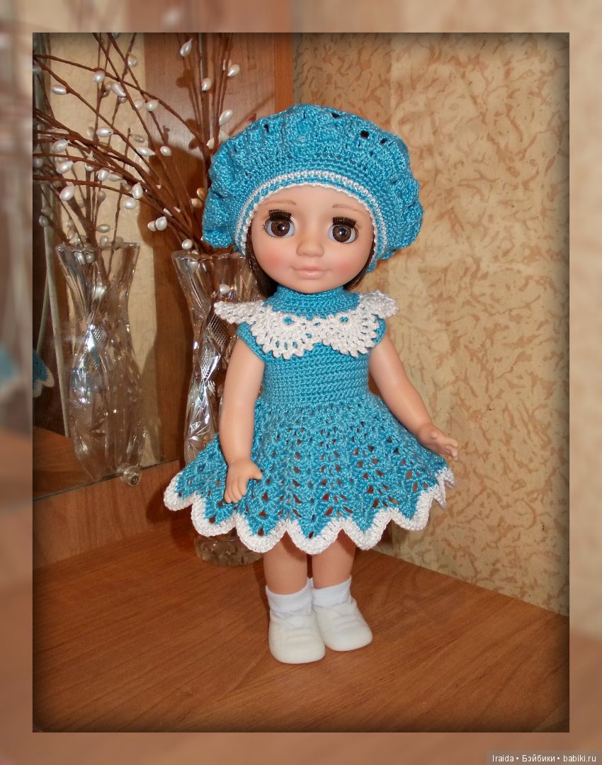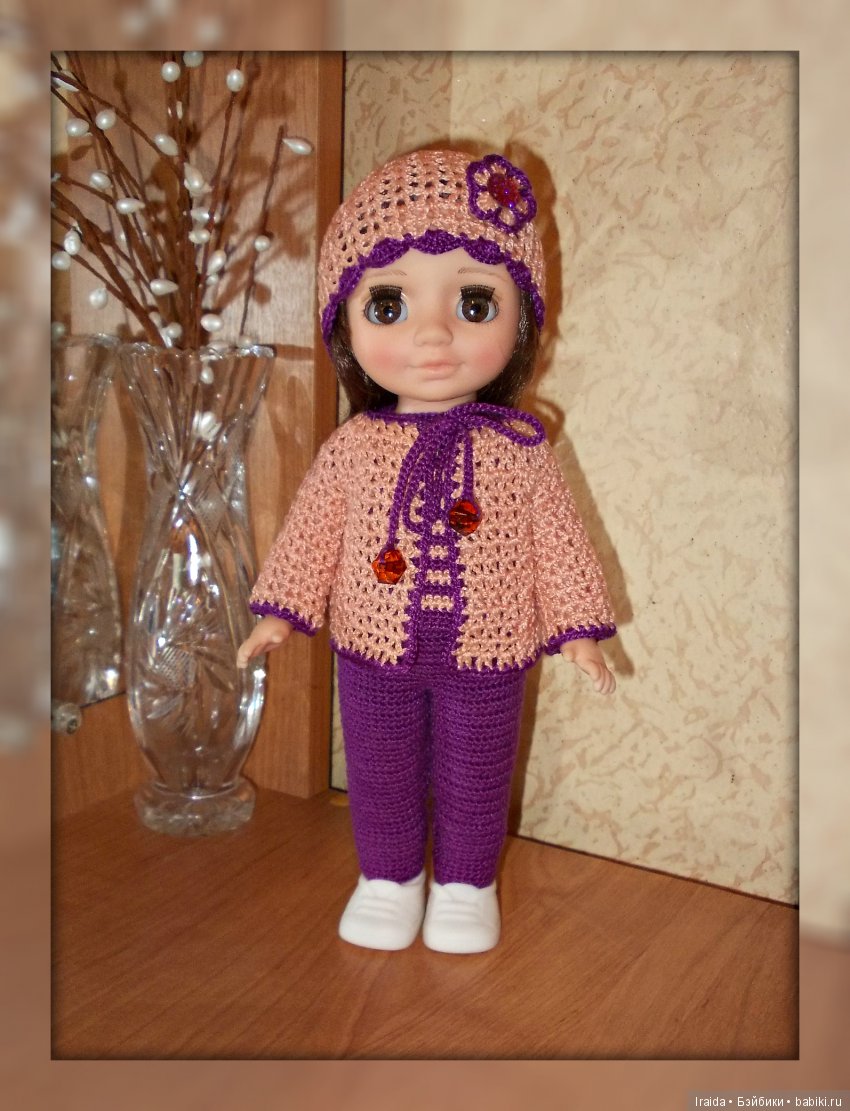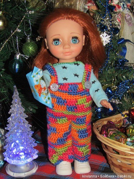 Приехала моя Ася. Она такая маленькая. Почему-то сразу захотелось одеть её в комбинезон. У кого есть такая куколка в вязаной одежде, покажите фото.