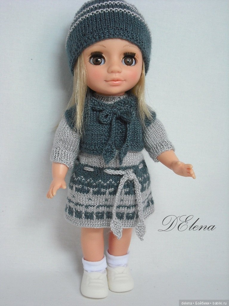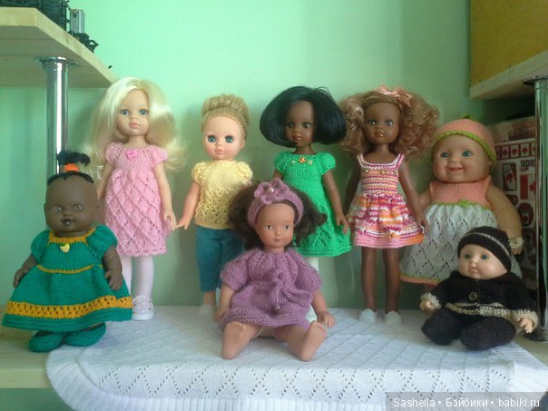 И тут общая фотка с др куклами, там вязаная кофточка и брючки от Мулин Роти (она в фиолетовом платьице сидит)