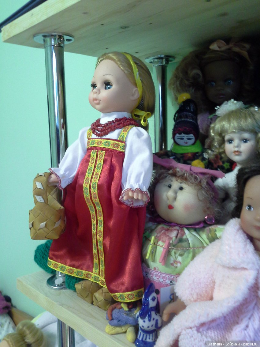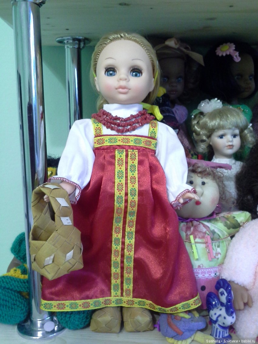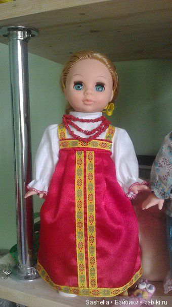 Сейчас в русском с красными бусами и с лукошком и лаптях, только фотки в них нет