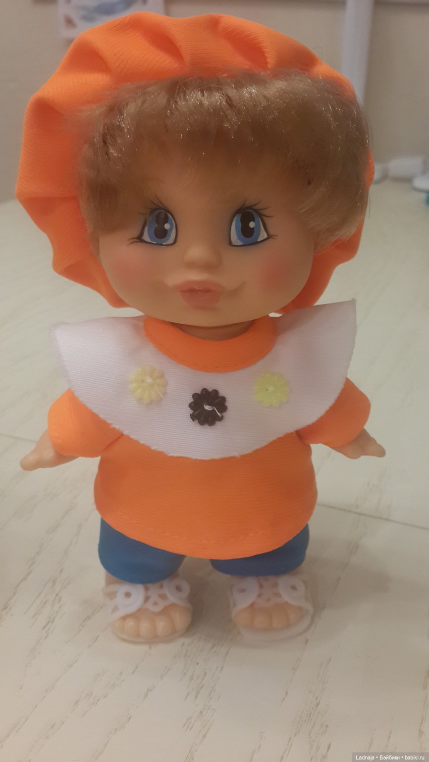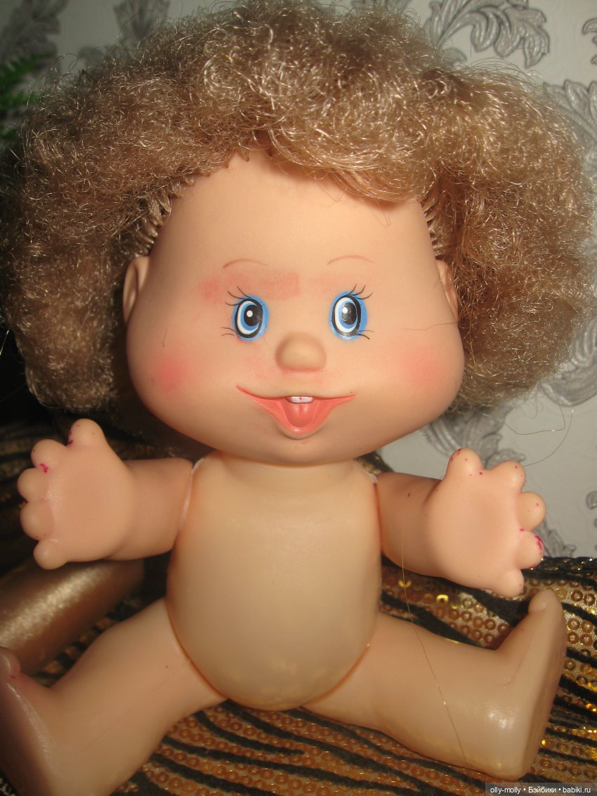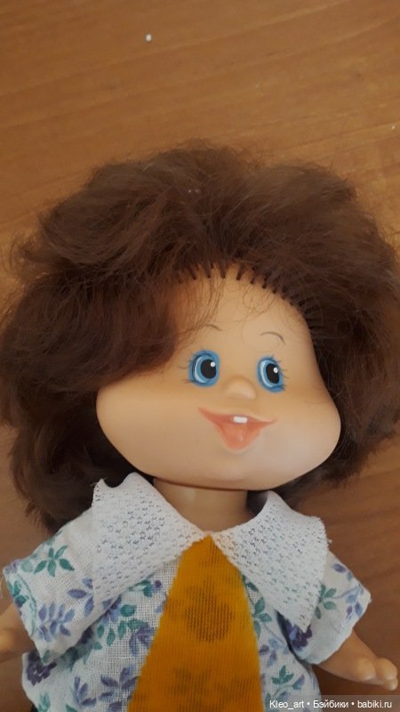 У нас в семье такая куколка появилась в 90-м году. Старшая сестра подарила младшей. Но мы как то не обращали внимание на этикетки и назвали её Валюшкой) Конечно и волосики уже частично покинули голову и пятна. В общем заниматься надо ей.