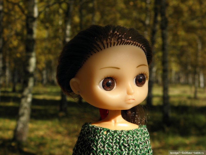 Мне повезло получить ее в подарок. У нее большущие глаза, которые смотрятся завораживающе, а тело как у большинства российских барбиобразных. Это Барбара («Пластмастер»). Таких уже не выпускают. Меня очень порадовал ее аутфит, и, поскольку моя кукла это — «Барбара в парке», то в парк я ее и отнесла. И сфотографировала.
