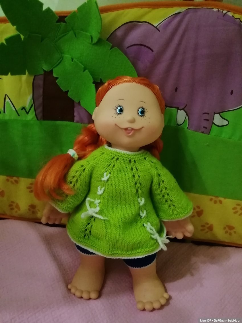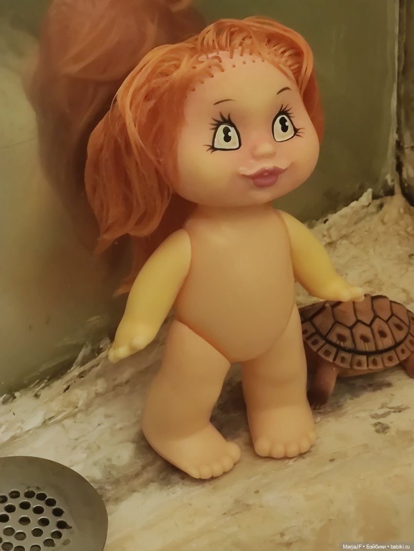 У куклы мягконабивное тело. Крупные ручки и ножки. Девчушка не худенькая. Волосы очень яркие. И что интересно — прошивка хорошая! Что я ценю в куклах. Как оказалось, раньше было несколько вариантов таких кукол и мне бы больше понравилась Шурочка с косами, тоже рыжая. Но на данный момент вариант только один. Рост на сайте заявлен 35 см, но у моей куколки 32 см.