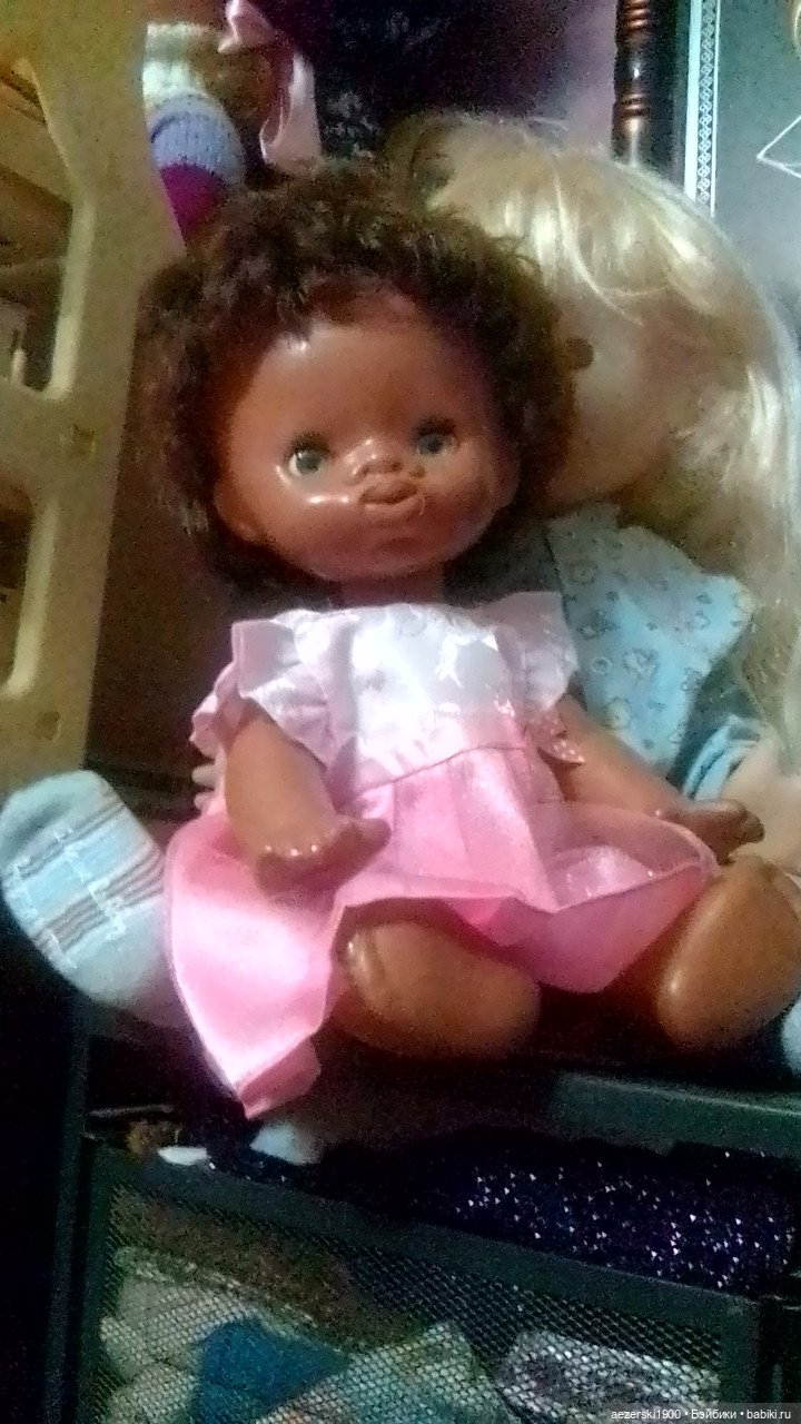 Принесли домой, отмыли. Наш добрый папа чем то залил погрызы и дырки в ногах у куклы, высушил и зашлифовал. Из носка сшились колготки и майка, из остатков дочкиного свитера — юбка и косынка. И девочка приобрела вполне приличный вид.