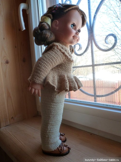А еще она приятно занимает маленькое место на рабочем столе. Стоит и внимательно смотрит своими большими синими глазами на нашу деятельность! И самое приятное, что нам совсем не хотелось сразу же переодевать куклу в домашнее, как это часто у нас было с другими куклами. Нам приятно было видеть ее в родном аутфите. Который выполнен в пастельных тонах, из натуральных тканей.