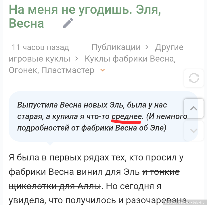 Сначала я поискала по сайту, нашла топик с виниловой Элей. И очень сильно разочарована. Хорошо, что голова снимается, можно гибридить. Но на этом новом теле она очень похожа на Паолку: шея как у гуся и пухлые щёки… Хорошо хоть не пахнет. Впрочем, она может пахнуть сколько угодно, мне такая совсем не нравится. По-моему вышло как-то убого. Простите уж. При всём уважении к фабрике. Какая-то пародия. И это при том, что я спокойно отношусь к разного рода заимствованиям в творчестве. Но там… Очень сложно мне писать своё мнение максимально корректно, потому что оно у меня некорректное. То ли на фабрике поувольняли художников совсем, то ли глаза у новых художников растут… нестандартно расположены они у них. 🤭🤭🤭 Так вроде корректно.
