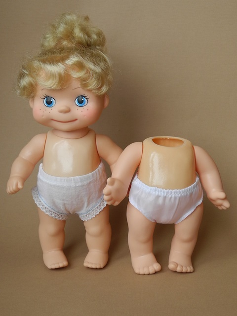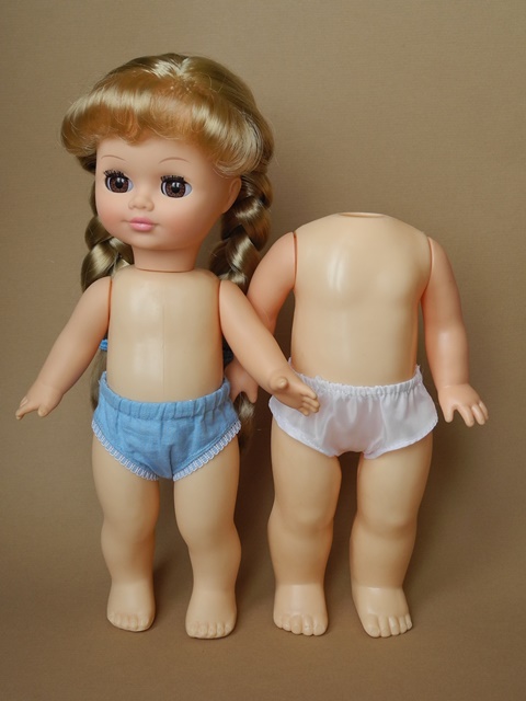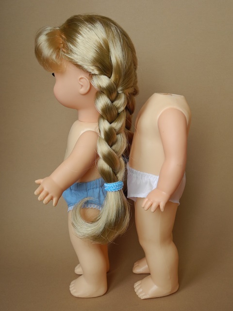 Маринка, номер модели не помню, из ранних. Пересела на тело Павлика. Родное тело справа. Разница только в конечностях. Родные мне не кажутся ни милыми, ни забавными.
