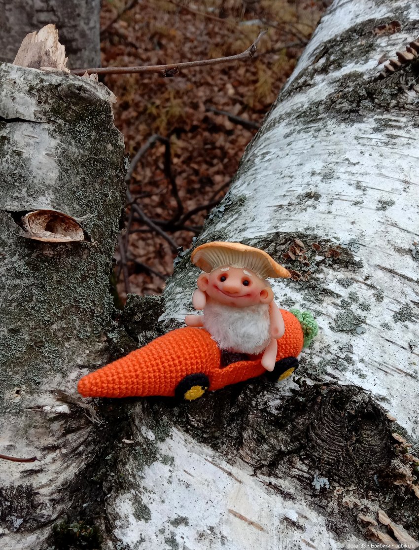 Ниточное крепление позволяет принимать сидячее положение. Ростом этот милый шофер около 13 см. Овощемобиль имеет руль и дверцы, которые закрываются на пуговичку.