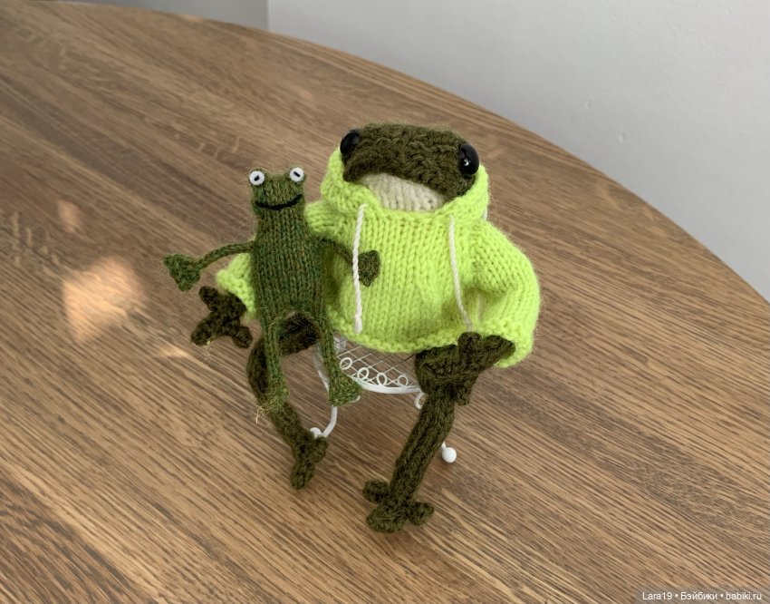 В нашем доме в весеннюю пору появился любимчик, это один из первых лягушат, связанных спицами по описанию Клэр Гарланд, так называемый, пилотный проект.