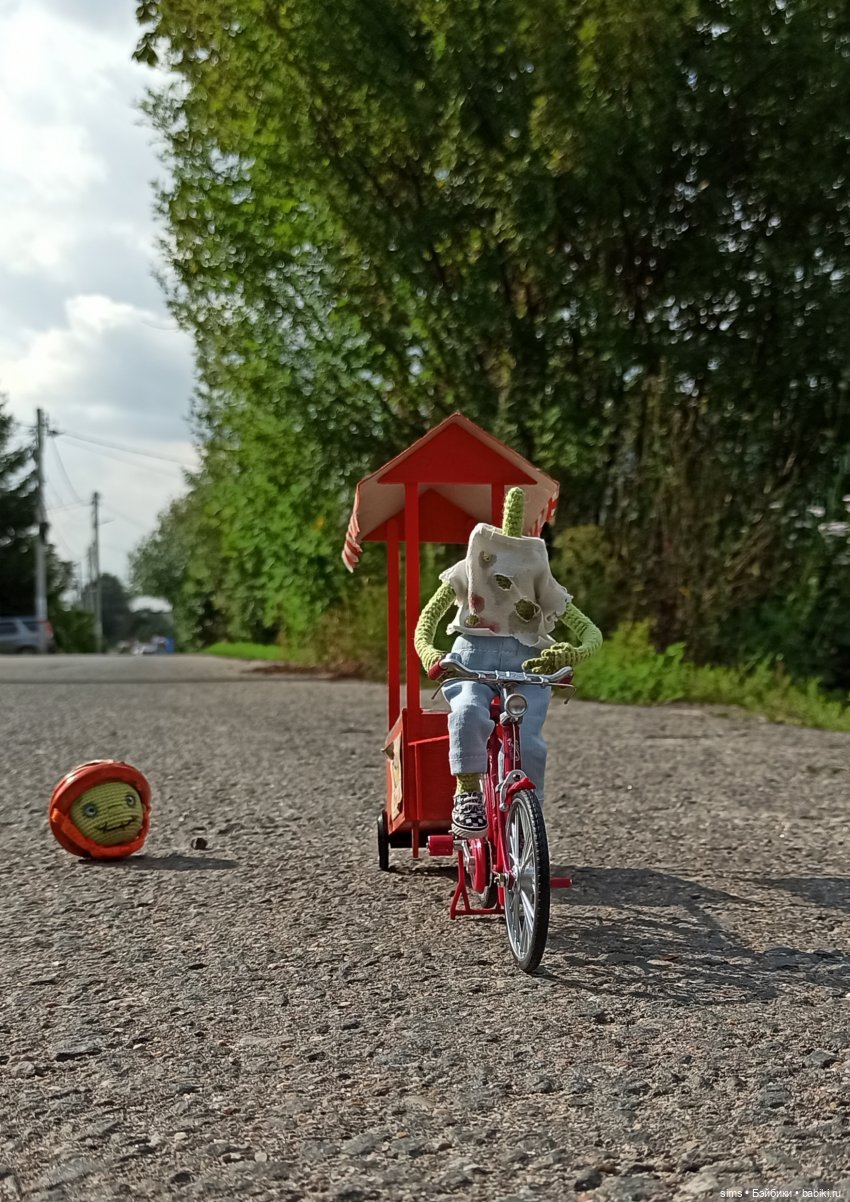 Связала Пака без схемы. Пряжа — хлопок, свитерок из шерсти, брюки джинсовые[модный парень]. Внутри проволочный каркас. Тыквёнок совсем крошка — 15 см. Наверное, самый маленький персонаж, которого я вязала)