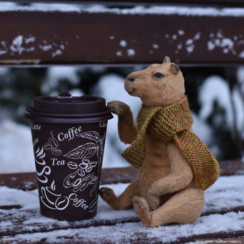 Однажды, когда на улице было пасмурно, я проходила мимо кофейни. Мне пришла в голову мысль: «А почему бы не зайти сюда и не выпить чашечку кофе?»Поскольку я была не одна, а с моим любимым вязаным медведем, я подумала: «Почему бы нам не устроить фотосессию?»