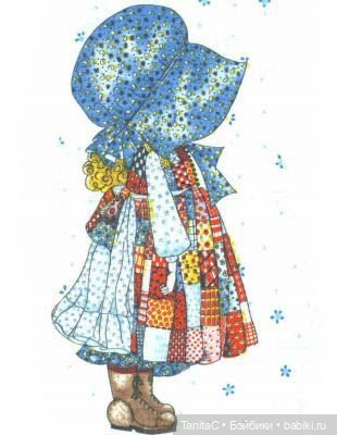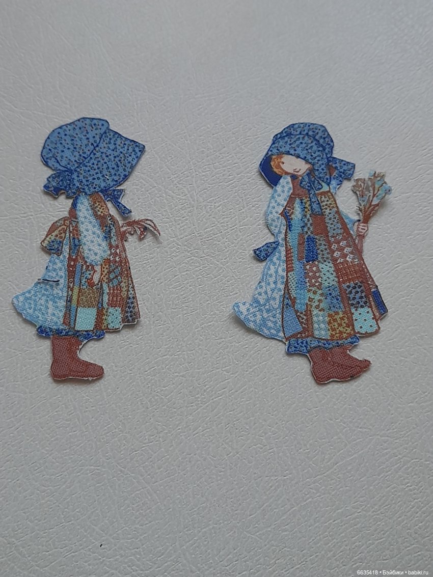 У меня давно лежит ткань с такой девочкой в принте ткани. Можно этот образ повторить в изделии, он интересный. Но я всё пыталась его использовать в качестве аппликации. К сожалению, в этих нарядах не нашла варианта из-за формата куклы.