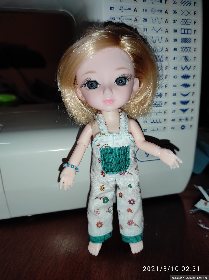 Теперь можно примерить на куколку, чтобы понять длину лямочки. У нас осталось отверстие незашитым, туда и проделаем одну лямочку. Я делаю сзади крест-накрест. Другую лямочку я не пришиваю, а то сложно надевать на куколку комбезик, ручки придется выкручивать сильно.