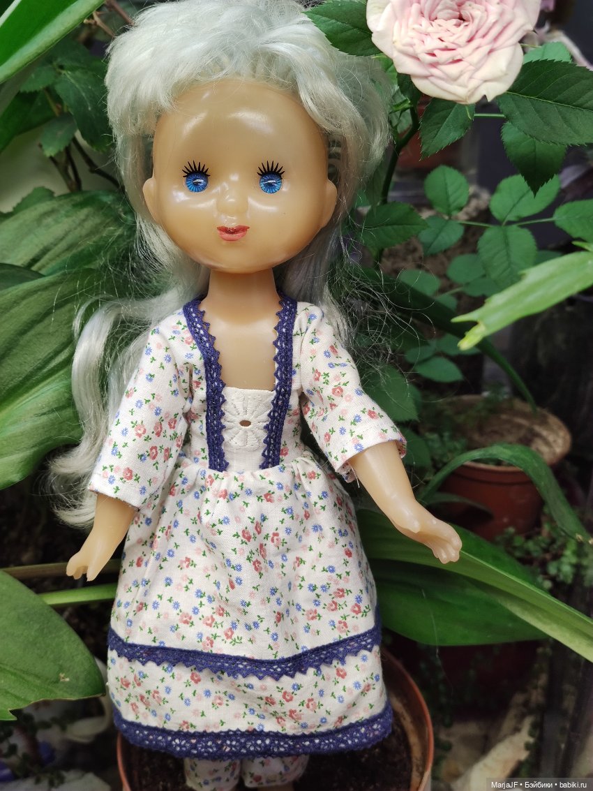 Было очень интересно работать над созданием этого наряда) словно в детство окунулась) когда я каждый день после уроков занималась созданием наряда для любимой Женечки) бережно укладывала потом все эти одежки в дипломат, который мне папа отдал. И было там 50 сшитых одежек, 50 вязаных. Я старалась создавать одежду в повторе — что было у меня, то и для Женечки шила и вязала)