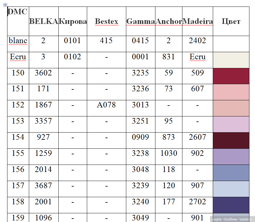 Сравнительные таблицы для мулине
