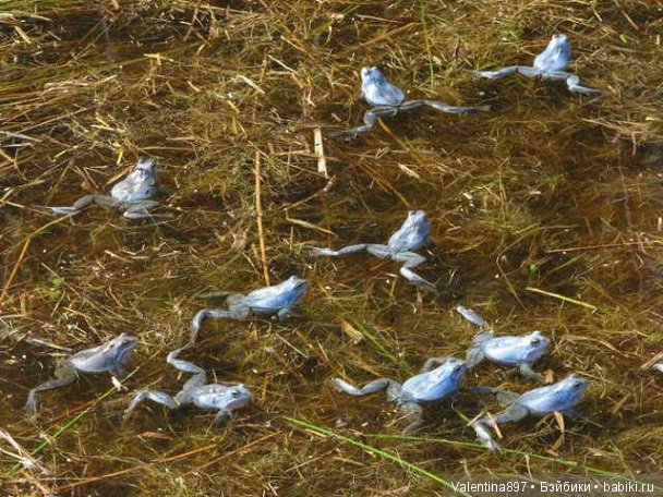 Это фотография взята из интернета, мои ушли в небытие с умершим телефоном))) Так вот, людей очень много в то время на дачах, в паре километров город… Гуляющих в этом местечке масса. Но на все мои вопросы что это за голубые лягушки, мне никто не смог дать ответа… Люди их просто не замечали… А мы с дочкой зависали возле местечек с голубыми лягушками, слушая их кваканье)))) И только потом прочитала в интернете, что это самец остромордой лягушки, и голубым он становится во время периода спаривания, а потом приобретает свой буро-серо-зеленый цвет.