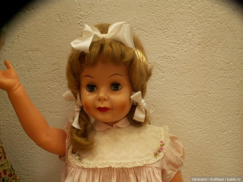 На стене фото хозяйки с этой куклой: в детстве, когда подарили, и уже в современнои виде. Лицо куклы ближе.
