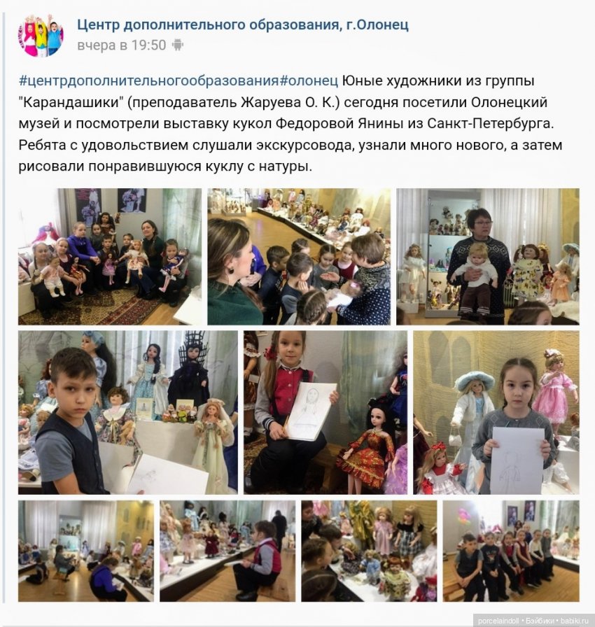 "… Сегодня, 27 января 2020 года в Республике Карелия г. Олонец, в 12.00 в Олонецком национальном музее открылась замечательная выставка "Мир кукол" петербургского коллекционера Янины Фёдоровой.
