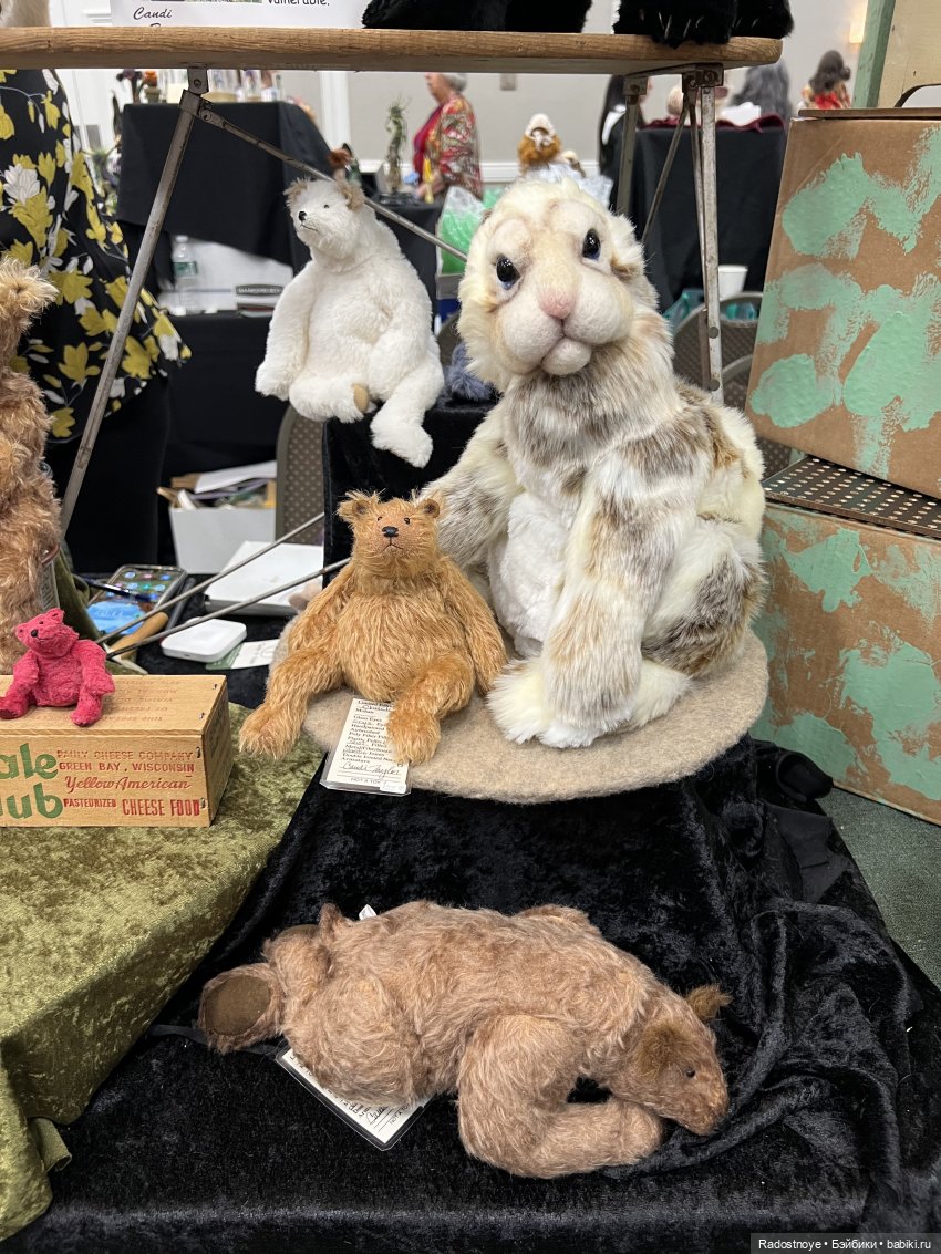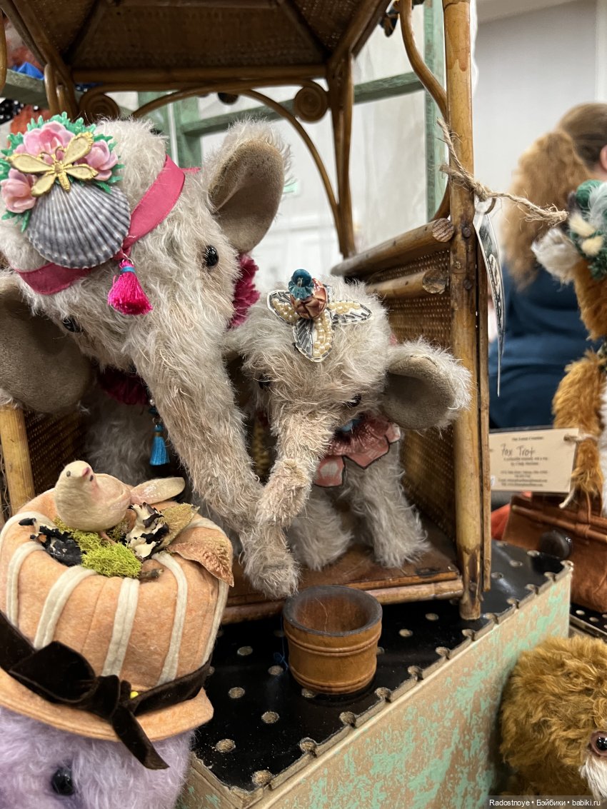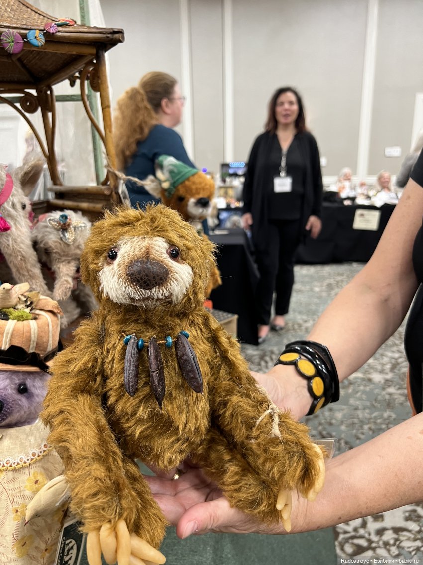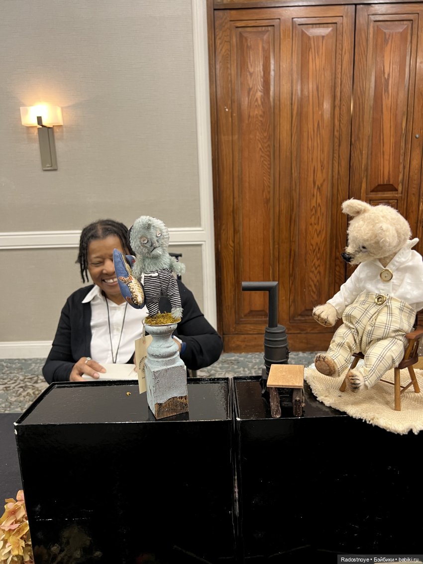 Эта автор прилетела из Великобритании. Все ее мишки разобрали уже, кроме одного — с рогами. Ее знак — это кристаллик в носу.
