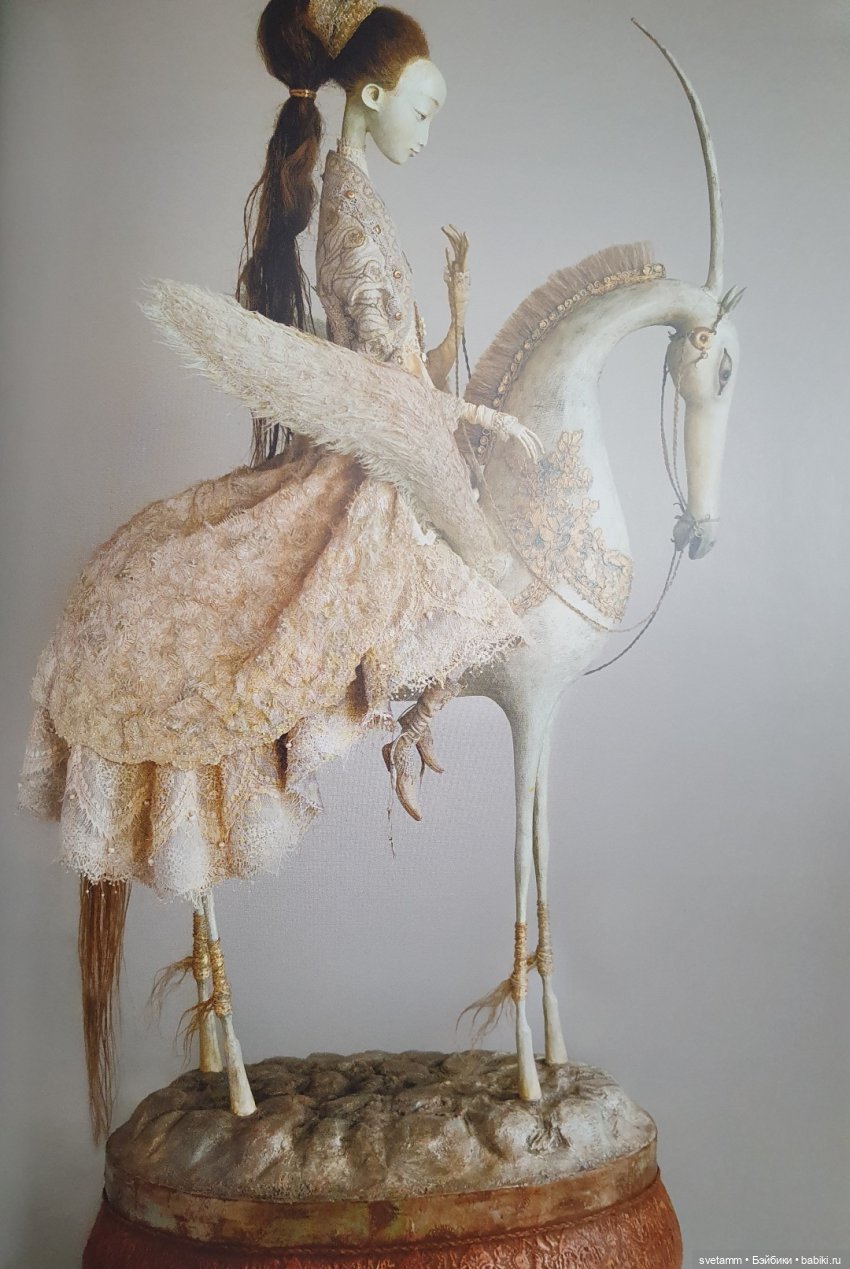 В нарядах и дополнительная вышивка нитками, бусинами, биссером, и сочетание нескольких видов ткани. У каждой свои птички в руках, в прическах. А какие замысловатые прически. Кони — отдельное чудо. Я таких красивейших Единорогов и Пегасов ни у кого не встречала.
