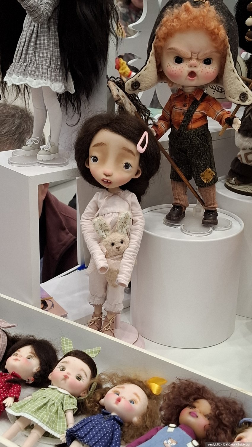 «Вы можете ничего мне не дарить!!! Отвезите меня на выставку!»-с таким лозунгом я решила в пятницу. В Москве я не была еще на таких мероприятиях.Но точно знала-надо ехать к открытию.Нас с сыном в 11.00 оставили у дверей и вперед🙂.Касса работала с 12.00 и мы прошли вдоль фудкорта, нашли гардероб и зашли внизу в перекресток чтобы убить время.Милая женщина на кассе вручила нам несколько пакетиков с акционными мишками Беартрикс.Мой сын потом на фудкорте их собирал, пока ждал, когда мать даст еще круг 🙂😂.Пока я стояла в очереди, со всеми поговорила.Кто что ждет от выставки, чем интересуется, что хочет приобрести? Там наверное столько наших форумчан было!!! В общем, влетела я по ступенькам и сразу в стол Карденчиков и Тины Васса.В жизни эти творения настолько необычны и атмосферны.У Тины было два стола и мы там прям глазами общупали каждую куклу.Никого не было и некоторые брали в руки ее небольших зверушек.Фоткала я мало.Хотелось всё рассмотреть детальнее.Но было много народа и я не успела прям всё-всё обойти.Общалась с мастерами, говорила как прекрасно сделаны их работы.Многие прям в руки давали, хотя мы не просили🙂.А потом я увидела Михаила Зайкова и его творения.Отпад!!! Только у него я постеснялась спросить цену.У остальных -спокойно.После покупки первой куклы решили сделать перерыв.Я не устала от слова совсем.Познакомилась с коллегой по хобби и мы пошли с ней смотреть Минуш и Медовушек.У одной мастерицы на этих моделях были наряды.Там постоянно была толпа.А мне были интересны сами куколки.Они такие узнаваемые, никогда не видела кукол Мирославы, да еще разные молды.Короче, было супер! Я бы еще день походила.P.s а дома меня ждала красотка.