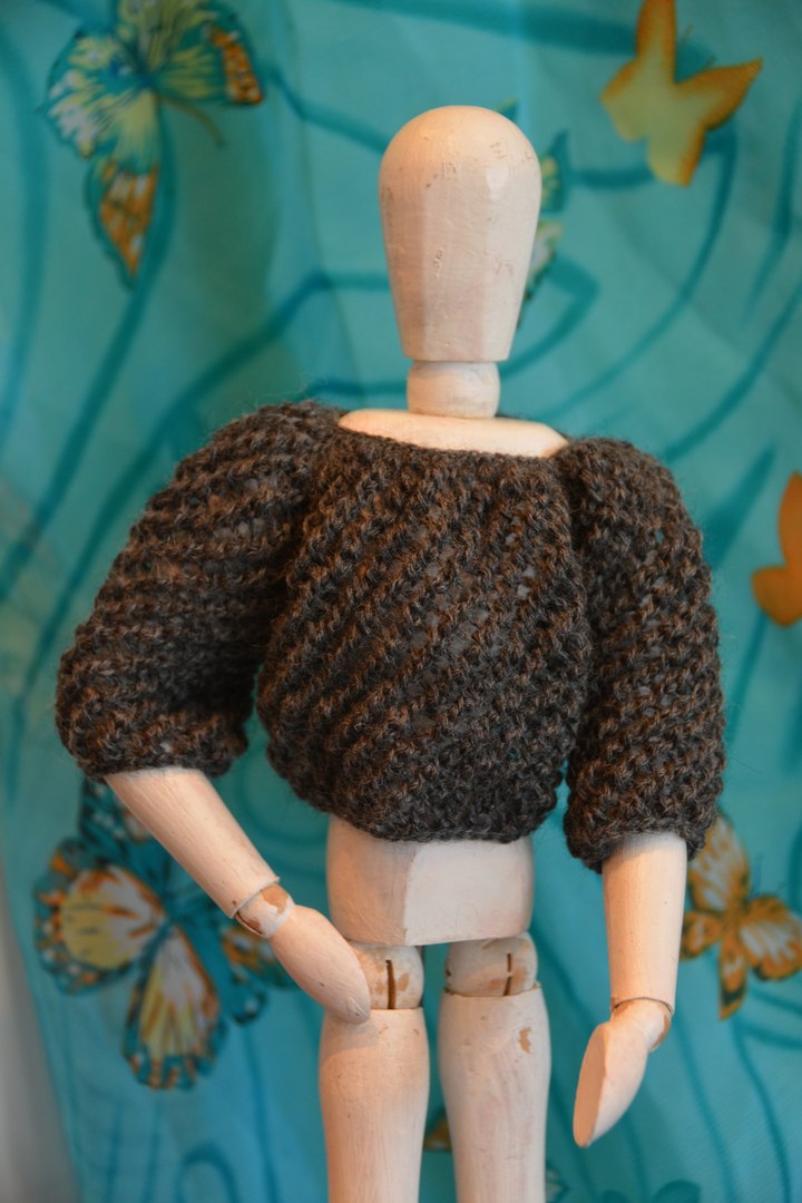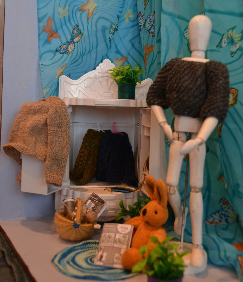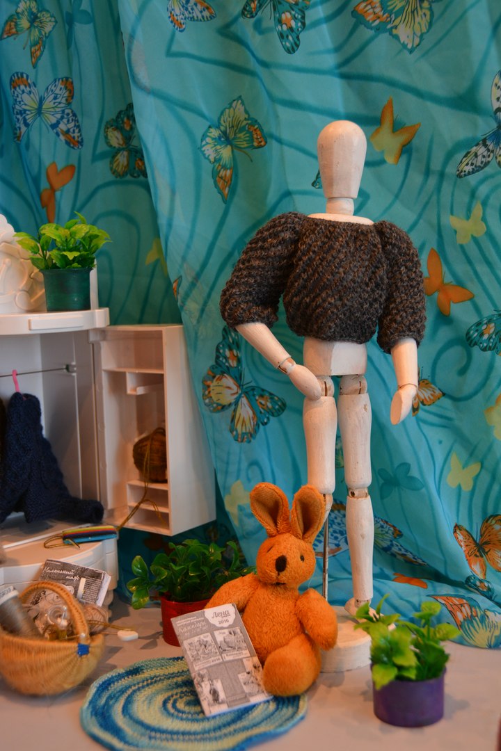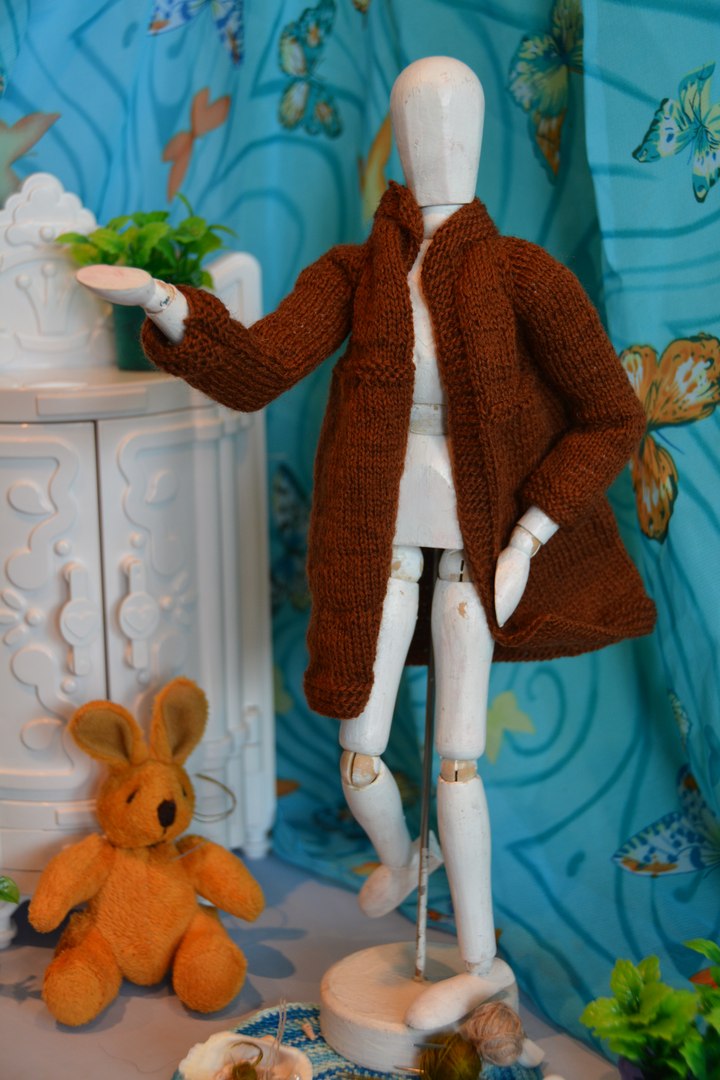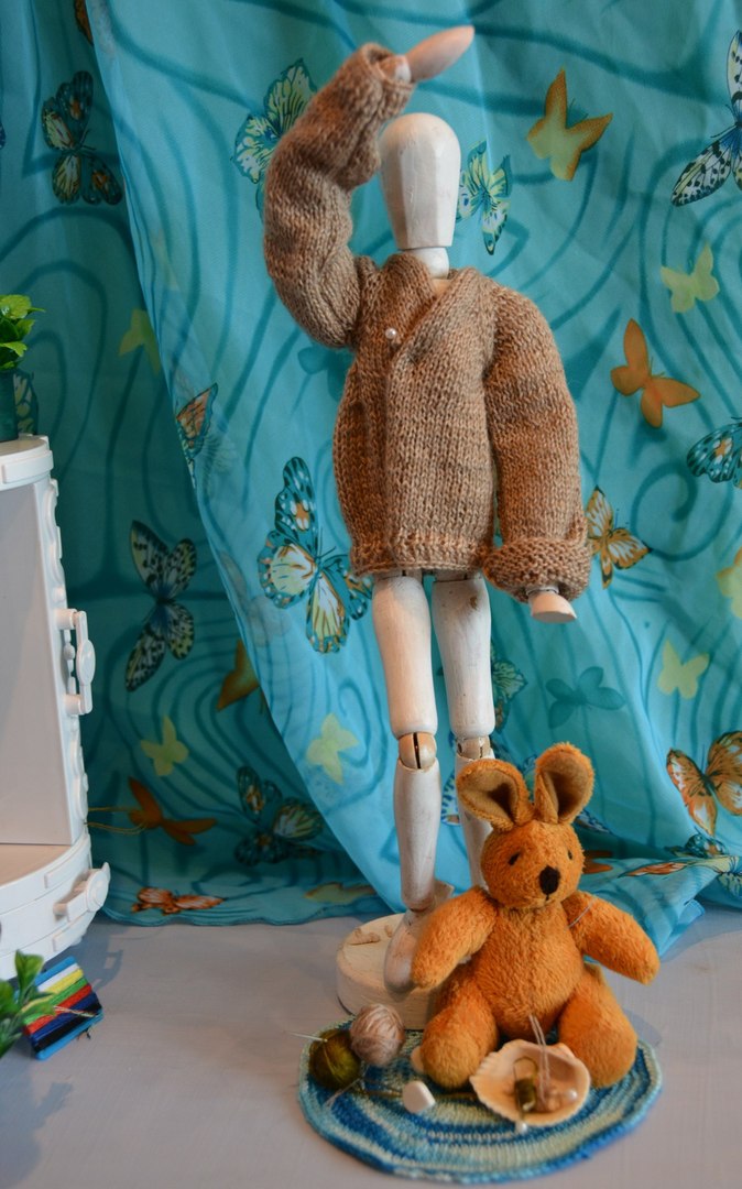Поскольку у меня нет кукол в подходящем размере и масштабе, то пришлось все вещи вязать исключительно ориентируясь на мерки, а для фотосессии уговаривать поучаствовать в примерке Георгия — деревянного шарнирного референса.
