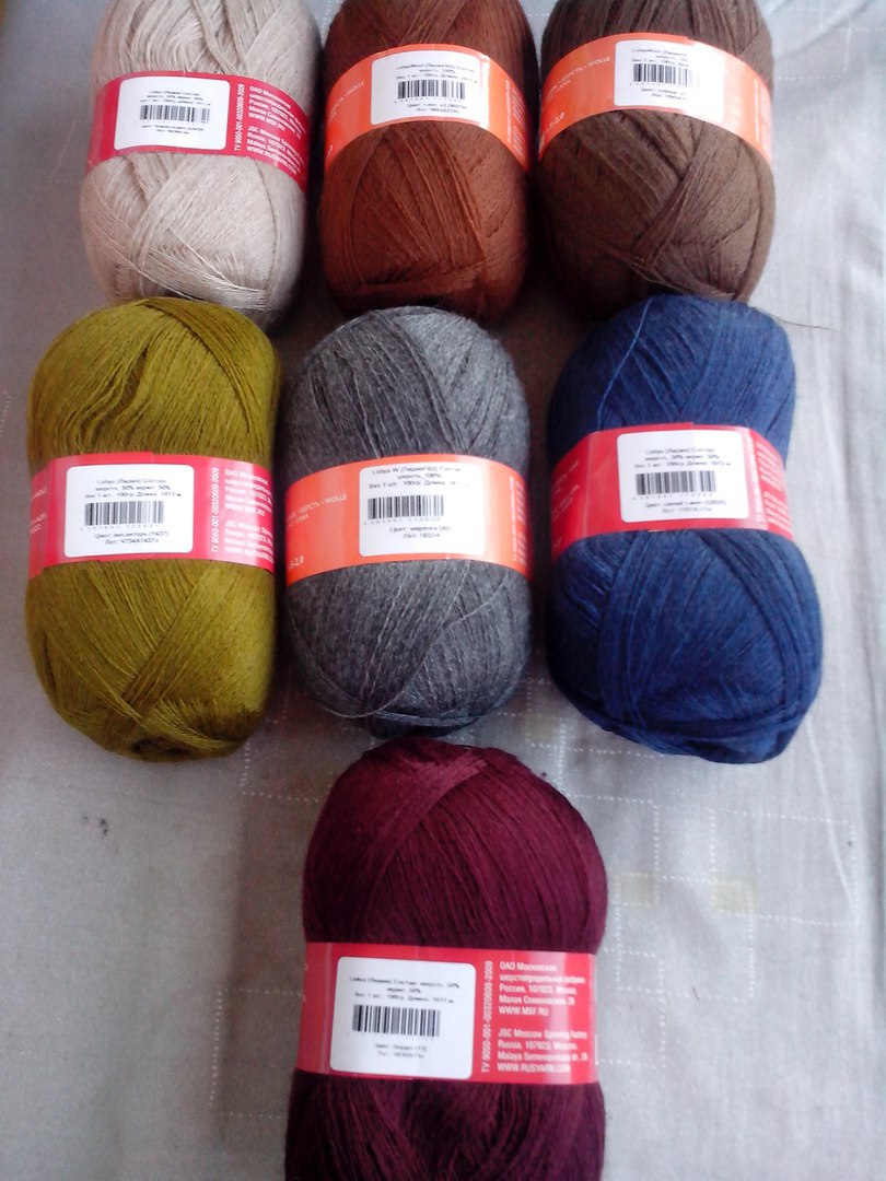 Для вязания была закуплена пряжа московской прядильной фабрики «Семеновская пряжа», тип пряжи «Лидия ЧШ» и «Лидия» следующих цветов:
