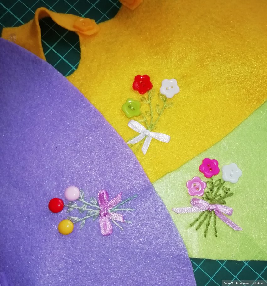 Платьица цельнокроенные из мягкого тонкого фетра, сиреневое и жёлтое из фетра толщиной 1,2 мм, салатовое из совсем тоненького — 0,5 мм толщиной. Края обрабатывать не надо.