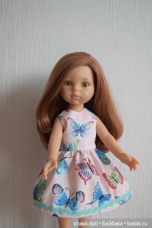 Поэтому я решила сшить летный наряд для кукол ростом 16 см из полюбившейся мне ткани с достаточно крупным изображением бабочек. А поскольку в своих изделиях для кукол я отдаю предпочтение более или менее пышным юбочкам, то этот принт в готовом изделии может быть «потерян».