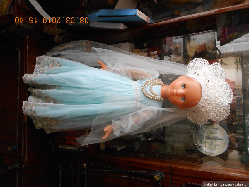 Самое время одеть днепрянку с белой косой в костюм Снегурочки. Белый шелк, серебряная парча (старая, из 80-х годов прошлого века), льдистый хрусталь, сияющий жемчуг… Но, согласитесь, все это сияющее великолепие совсем не затмевает милого нежного лица этой удивительной куклы! Во всех ты, душенька, нарядах хороша!