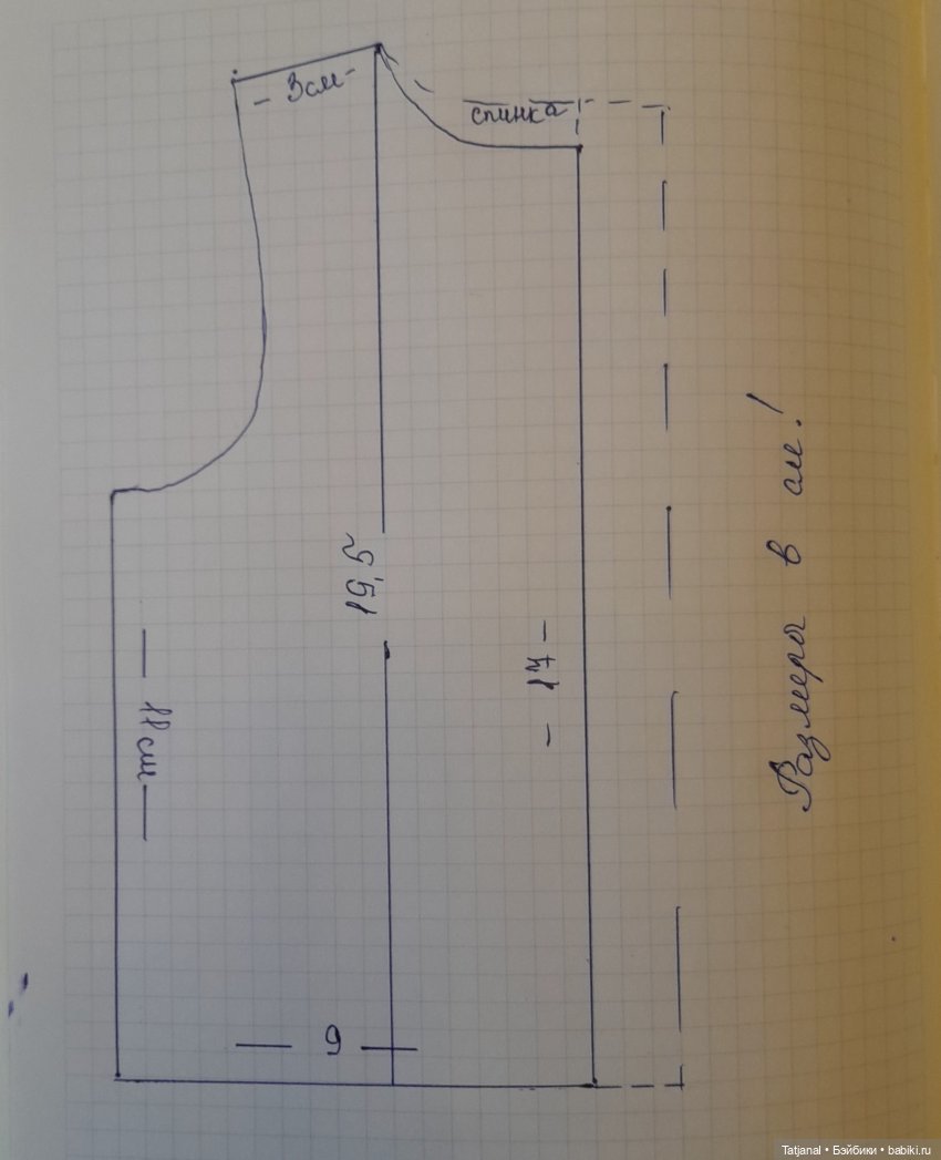 Про спинку-полочку. Не забываем про застежку на спинке, для этого прибавляем 1,5 см ( прерывистая линия).