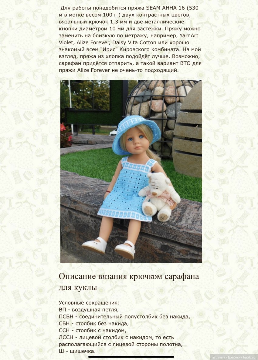 Вот увидела на просторах интернета фото куколки в таком сарафанчике, связанном крючком (фото не моё, если вдруг хозяйка будет против, то сразу удалю)