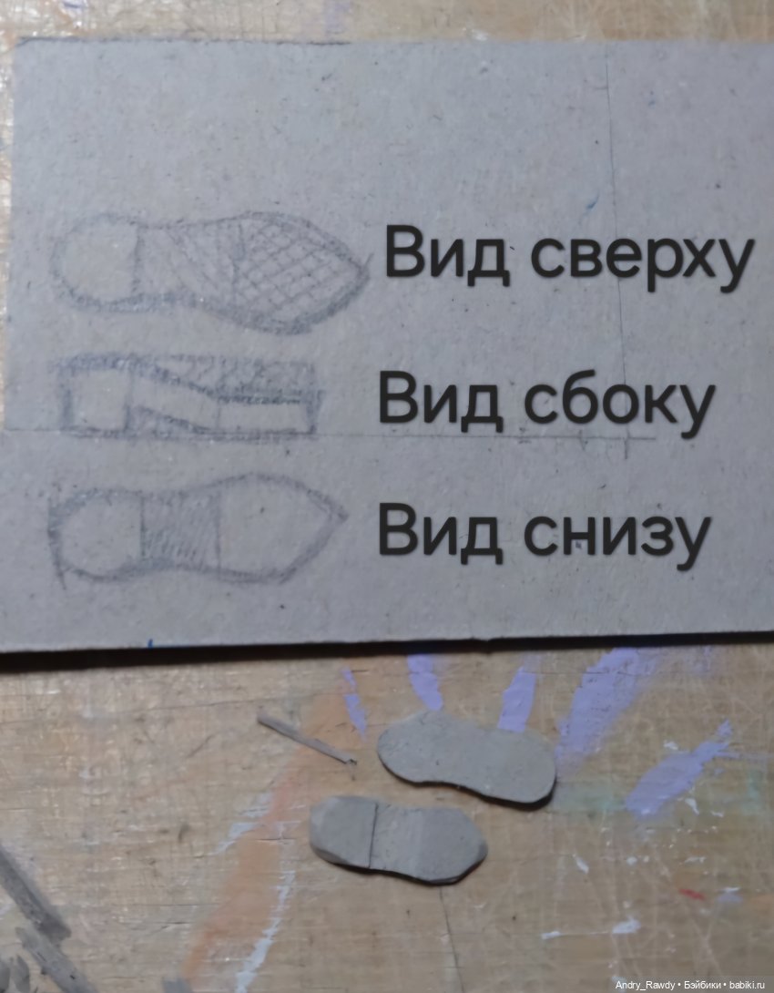 Мне удобно сразу делать по две-три пары обуви. Начала со стелек, которые покрасила акрилом. Потом подшва, это самое долгое. Вырезала ее, пилкой и наждачкой подкоректировала форму, покрасила акрилом. Тут уже и стельки высохли.