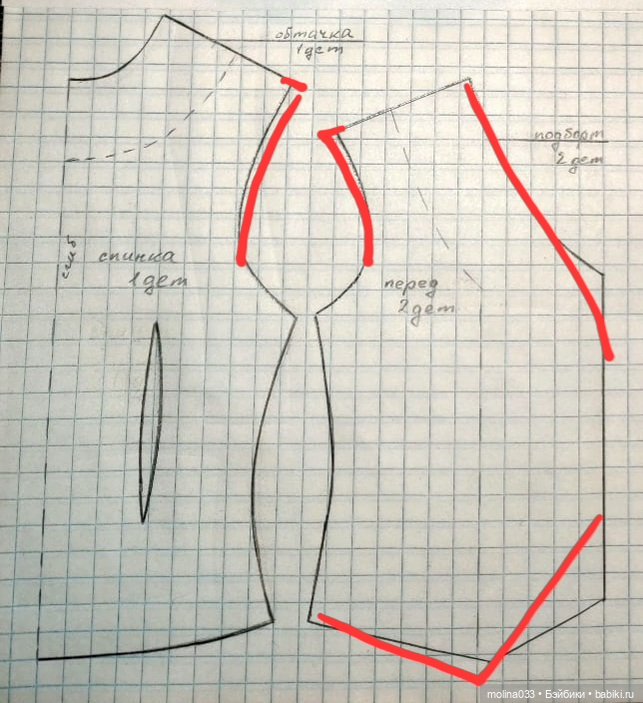 Шире плечи, чтобы выворачивать с подкладом было легче, не такая глухая на груди и мысики более выраженные.