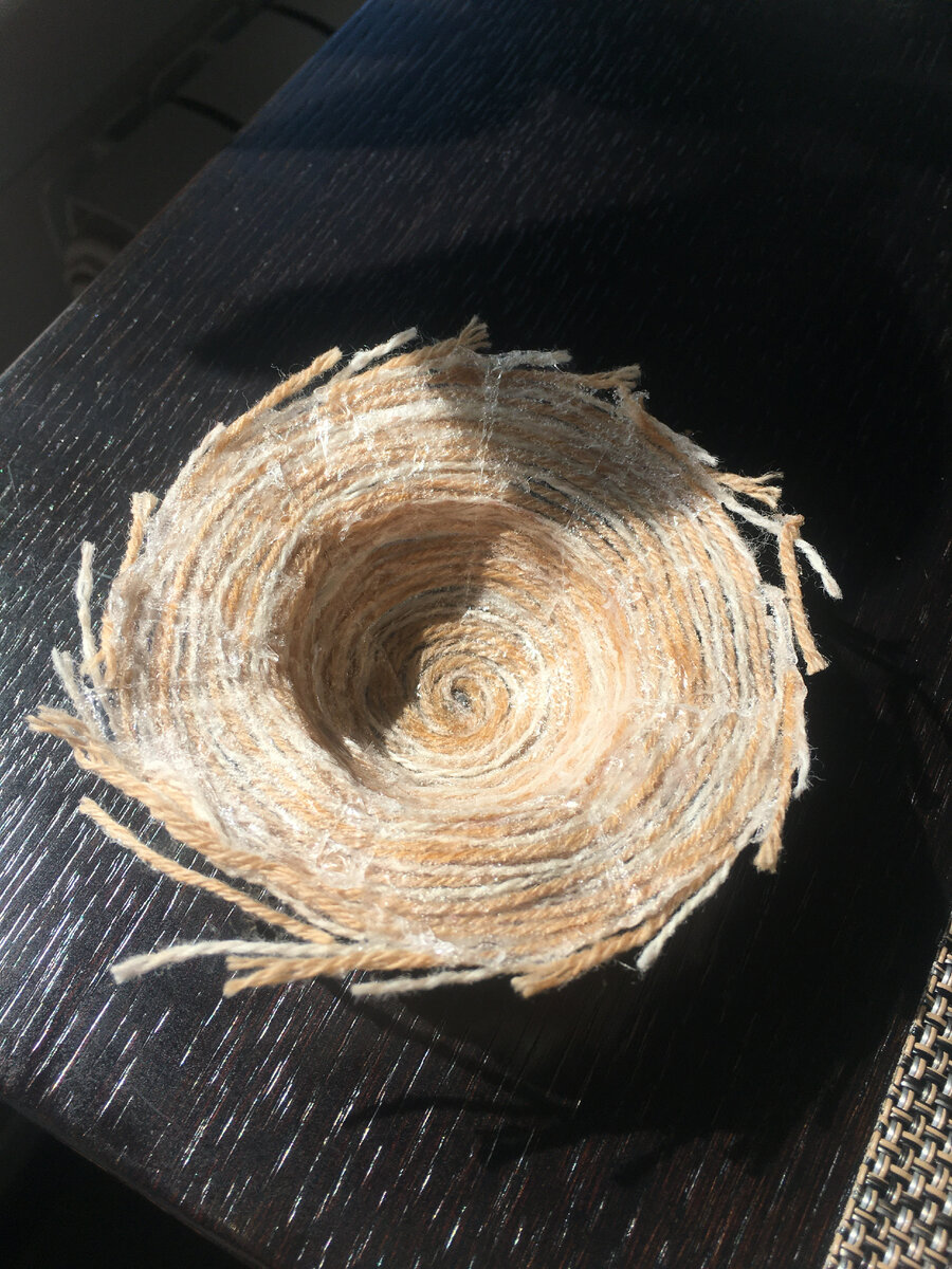 Далее снимаем заготовку вместе с пакетом с лампочки-основы и укладываем на ровную поверхность. Нитки обрезать не надо, ими же и продолжаем делать поля шляпы. Принцип тот же — мажем клеем пакет и наклеиваем рядами встык нитки по кругу до тех пор, пока ширина полей нас не будет устраивать.