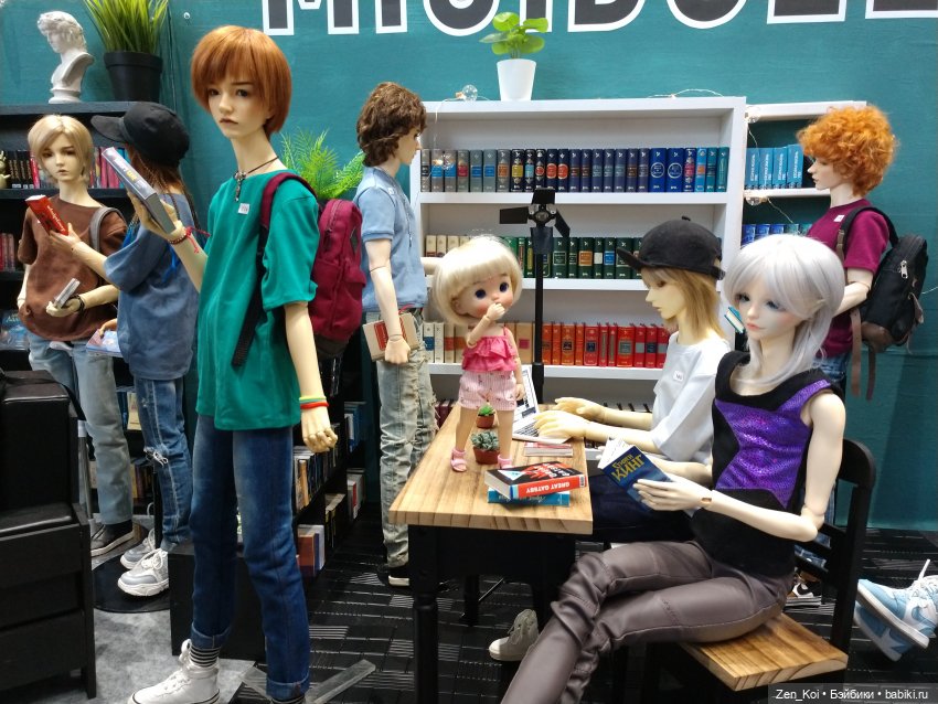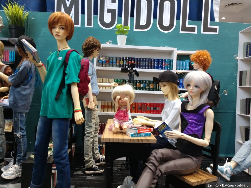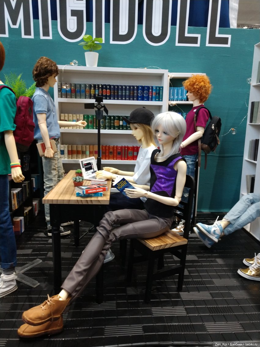 На сколько я знаю не на все стенды можно своих кукол сажать. Кто-то специально делает место для фото кукол-гостей, а кто-то вообще не разрешает. Со стендом мигидолл нам повезло. Моя подруга хорошо знает девушку что делала этот стенд, да и я до этого с ней на БЖД встрече немного познакомилась. И она разрешила куколок пофотать на всем стенде. А так можно было только за столом. Ну я Элиаса не стала пихать, слишком уж он огромный, а вот Гленку я в разных местах пофотала. 😁