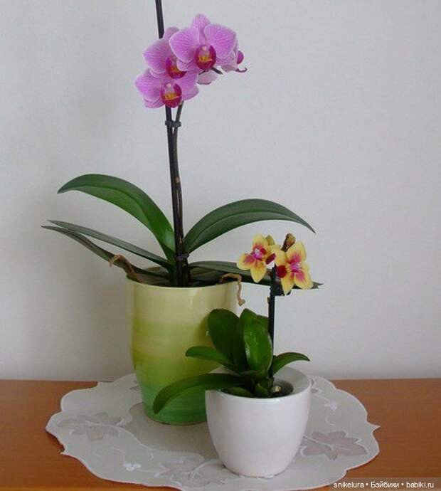 У фаленопсиса-мини небольшие листья, невысокий цветонос и цветы размером до 5 см. Есть совсем крошки — 1-2 см в диаметре, есть более крупные.