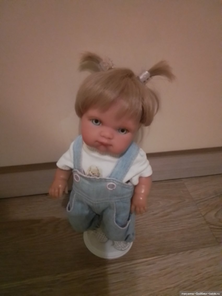 У меня Миленка — пупсик Антонио Хуан 21 см. Вроде бы она выполнена как младенчик. Но я ее вижу не младенцем, а малышкой 1-1.5 лет. Поэтому у нас нет никаких ползунков, чепчиков и распашонок. Шью платьица, комбинезоны на лямках, брючки, футболки, тунички. Из малышкового только слитники, и-то им следки со временем отрезала 🤣. Теперь носим слитники с носочками трикотажными.